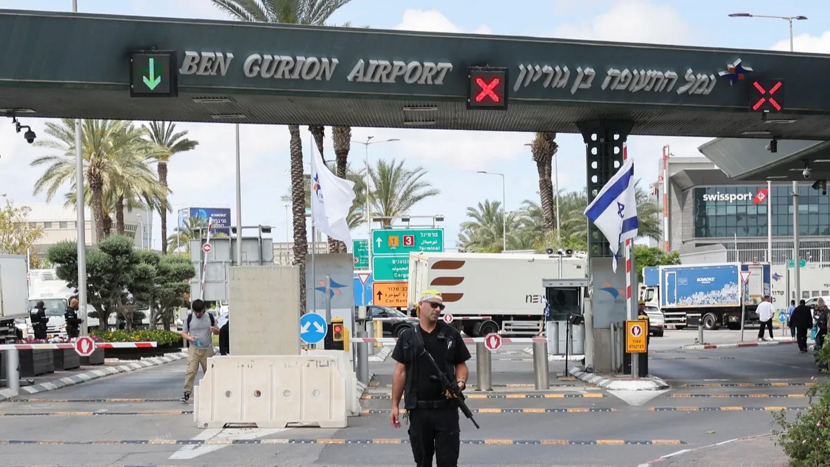 يقف أحد أفراد الأمن عند مدخل مطار بن جوريون في تل أبيب، إسرائيل. 4 مايو 2025 - Reuters