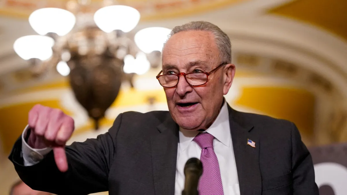 زعيم الأقلية الديمقراطية في مجلس الشيوخ الأميركي تشاك شومر  خلال مؤتمر صحافي في مبنى الكابيتول بالعاصمة واشنطن. 13 مايو 2025 - REUTERS