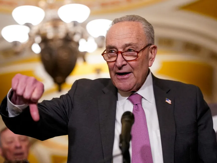 زعيم الأقلية الديمقراطية في مجلس الشيوخ الأميركي تشاك شومر خلال مؤتمر صحافي في مبنى الكابيتول بالعاصمة واشنطن. 13 مايو 2025 - REUTERS
