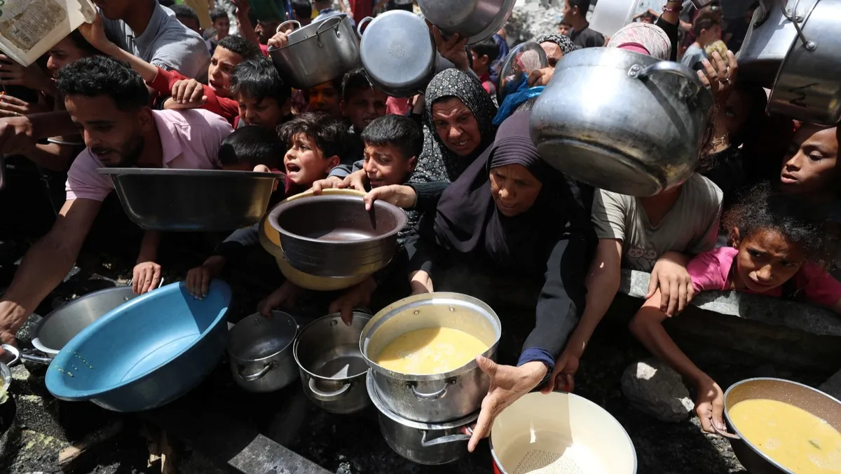 فلسطينيون ينتظرون الحصول على طعام من مطبخ خيري في جباليا. شمال قطاع غزة. 19 مايو 2025 - Reuters