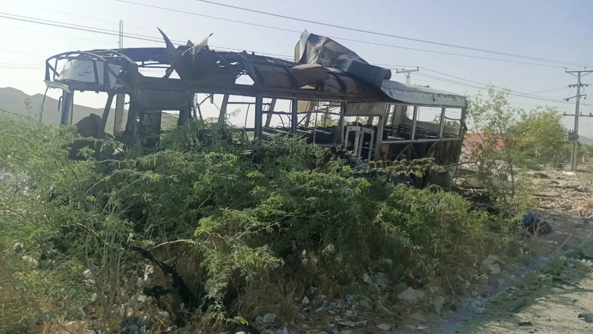 حافلة مدرسية مدمرة بعد استهدافها في هجوم انتحاري بمنطقة خوزدار وسط بلوشستان، باكستان. 21 مايو 2025 - URDU INTERNATIONAL