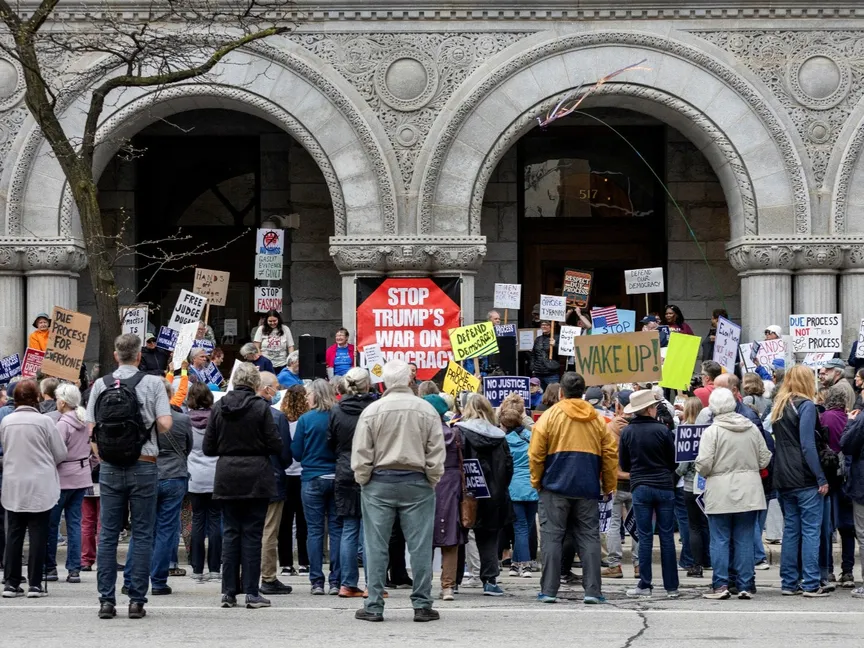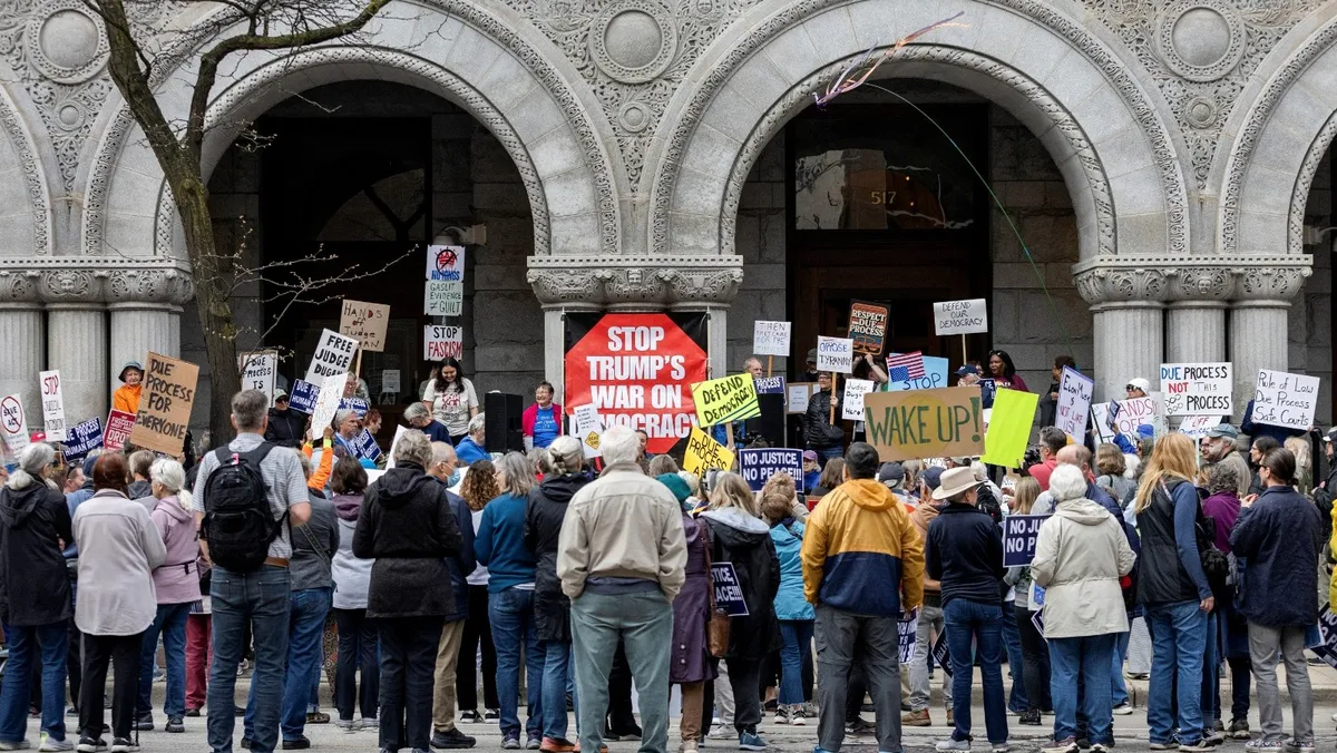 محتجون أمام محكمة ميلووكي للتضامن مع القاضية هانا دوجان أثناء مثولها للمحاكمة بتهمة عرقلة عملية اعتقال تتعلق بالهجرة في مدينة ميلووكي، بولاية ويسكونسن. 15 مايو 2025 - REUTERS