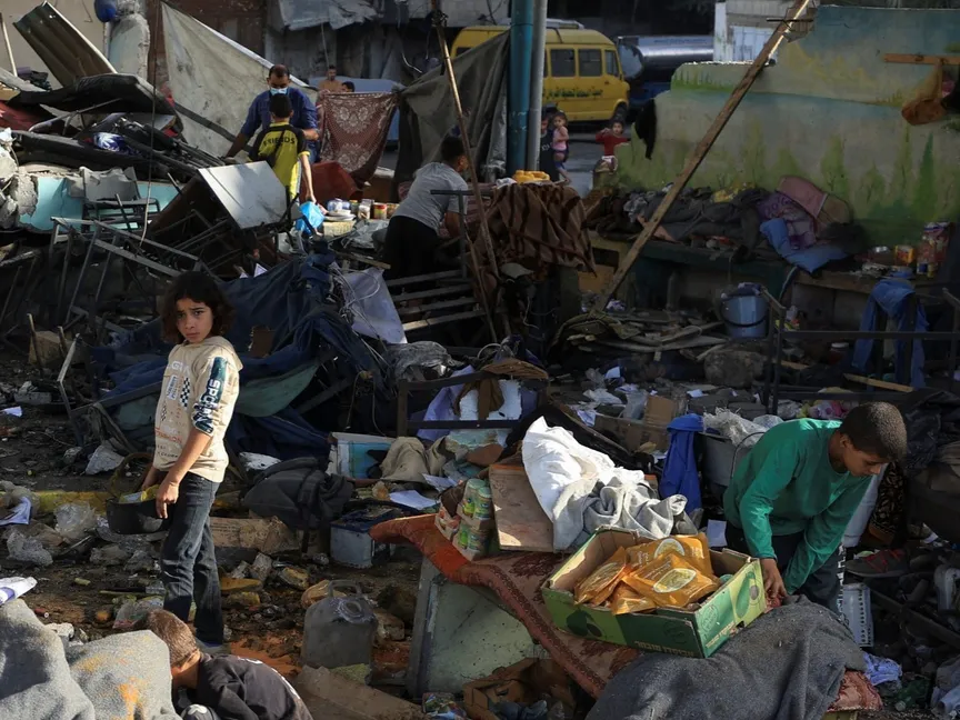 فلسطينيون يتفقدون أنقاض مدرسة كانت تؤوي نازحين في أعقاب غارة إسرائيلية دمرتها في مدينة غزة. 26 مايو 2025 - REUTERS