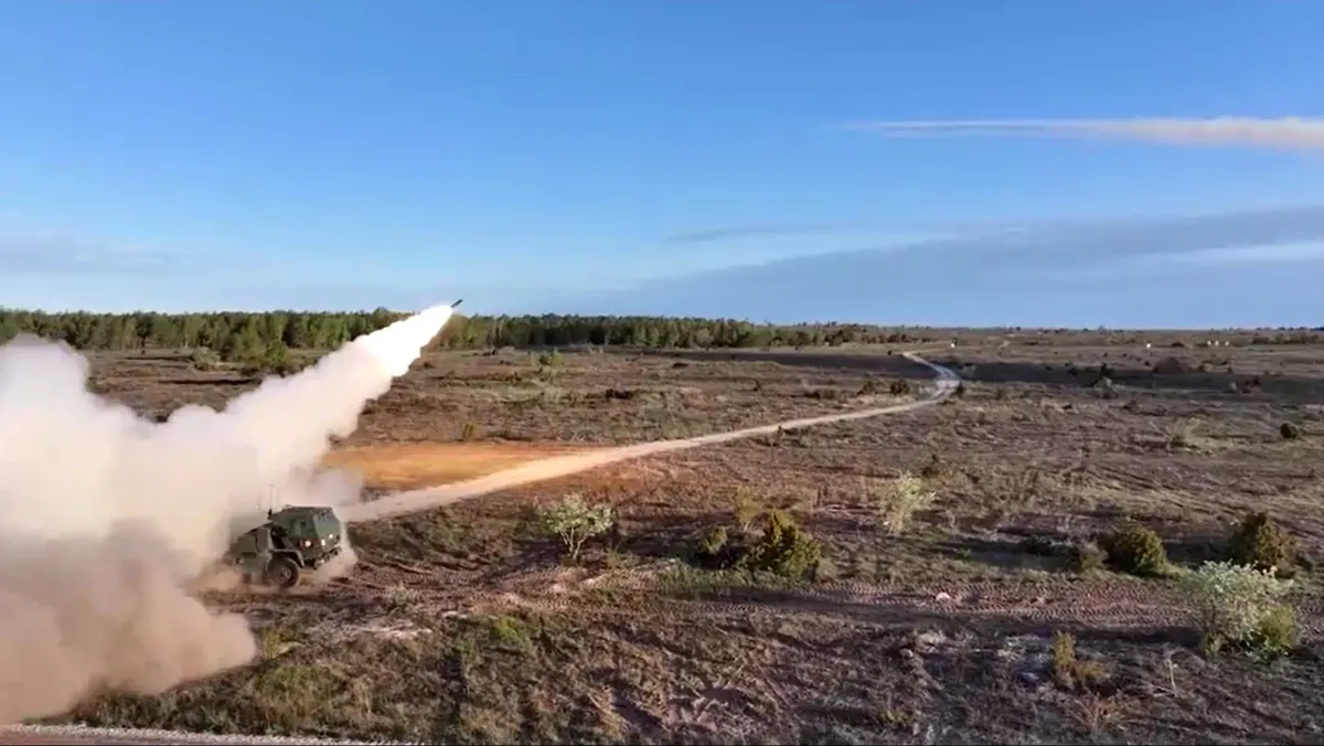 لقطة شاشة من مقطع فيديو يظهر جانباً من التدريبات التي استخدمت فيها الذخيرة الحية في جزيرة جوتلاند بالسويد. 21 مايو 2025 - Reuters