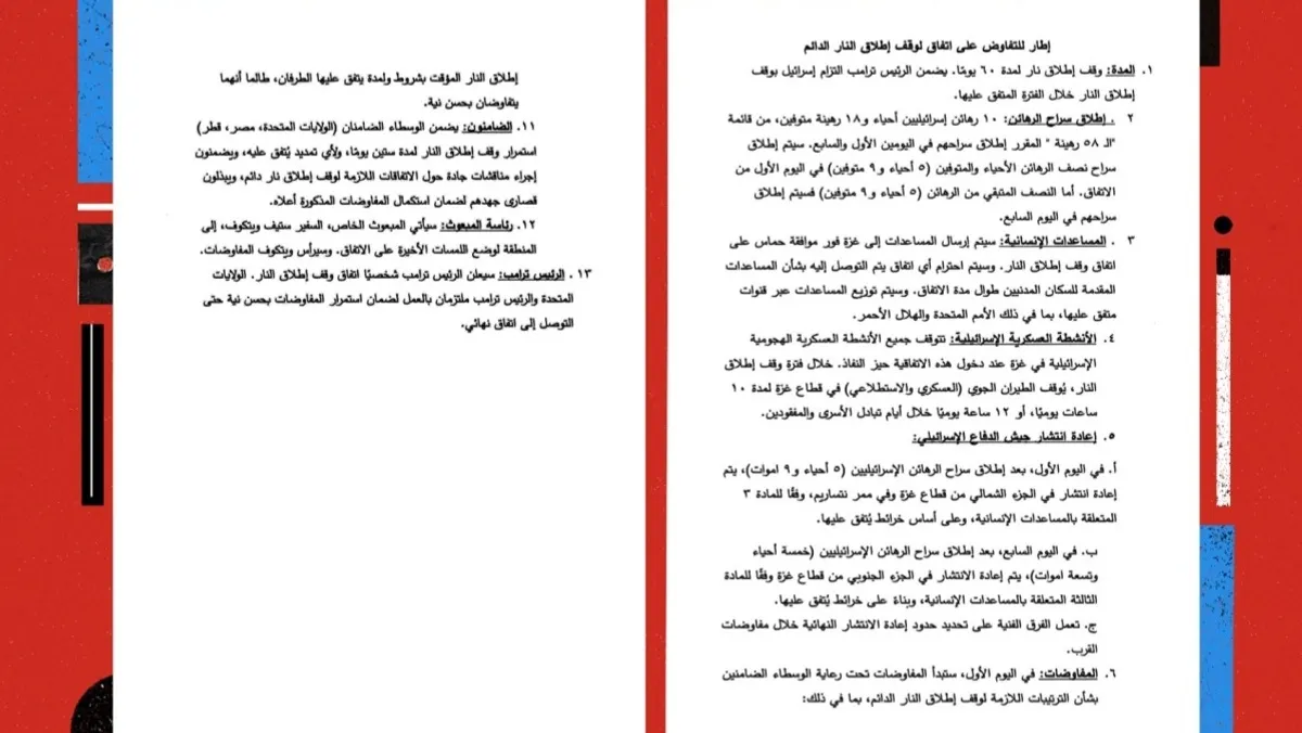 1- المدة: وقف إطلاق نار لمدة 60 يوما. ويضمن الرئيس ترمب التزام إسرائيل بوقف إطلاق النار خلال الفترة المتفق عليها.