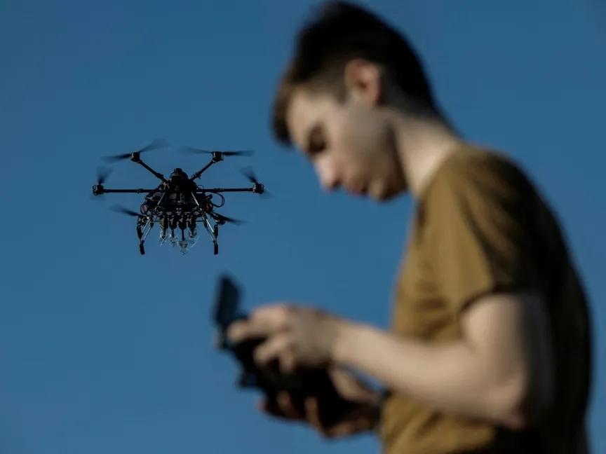 جندي أوكراني يتحكم في طائرة بدون طيار أثناء رحلة تجريبية في موقع غير معلن عنه في منطقة خاركيف بأوكرانيا. 22 أبريل 2025 - Reuters