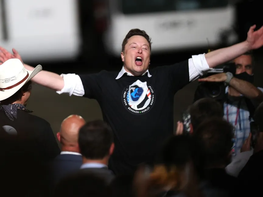 إيلون ماسك يحتفل بعد نجاح انطلاق صاروخ شركته إلى محطة الفضاء الدولية. 30 مايو 2020 - AFP