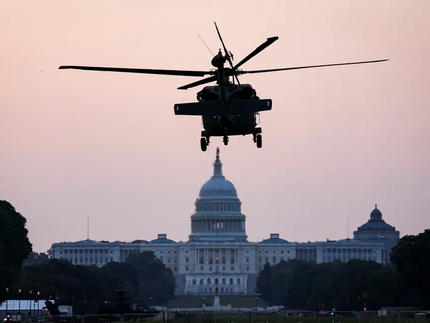 مروحية "بلاك هوك" من المقرر أن تشارك في العرض العسكري بمناسبة الذكرى الـ 250 لتأسيس الجيش الأميركي، تستعد للهبوط في "ناشيونال مول" بالقرب من مبنى الكابيتول، واشنطن. 11 يونيو 2025 - Reuters