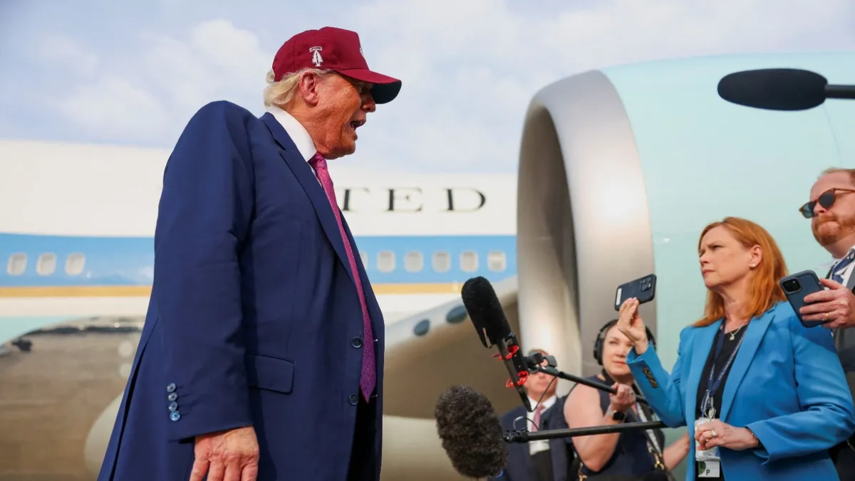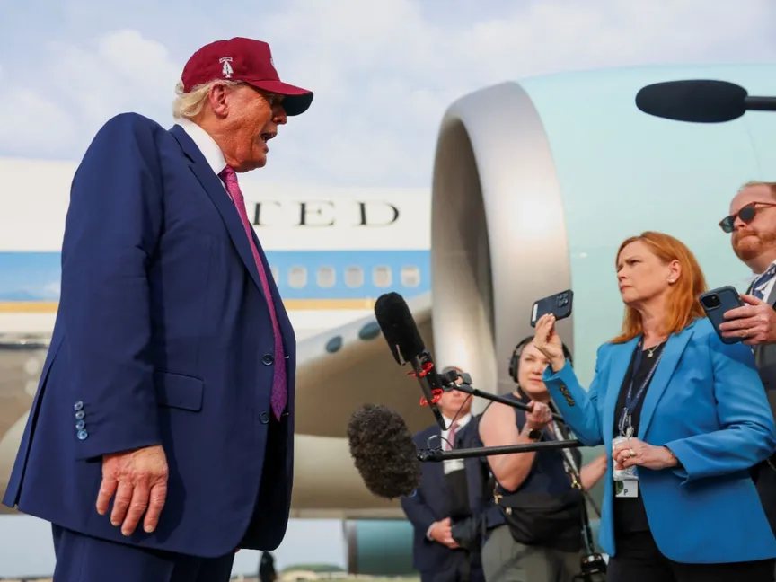 الرئيس الأميركي دونالد ترمب يتحدث إلى وسائل الإعلام في قاعدة أندروز المشتركة بولاية ماريلاند. 10 يونيو 2025 - REUTERS
