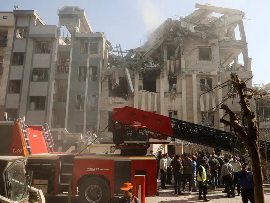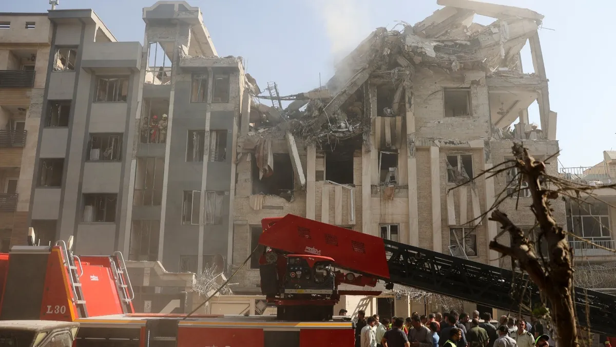 فرق الإنقاذ تعمل في موقع مبنى متضرر من الضربات الإسرائيلية على العاصمة الإيرانية طهران. 13 يونيو 2025 - REUTERS