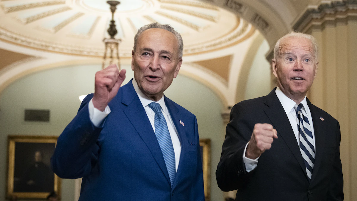الرئيس الأميركي جو بايدن برفقة زعيم الديمقراطيين في مجلس الشيوخ تشاك شومر في مقر الكونغرس - 14 يوليو 2021 - Getty Images