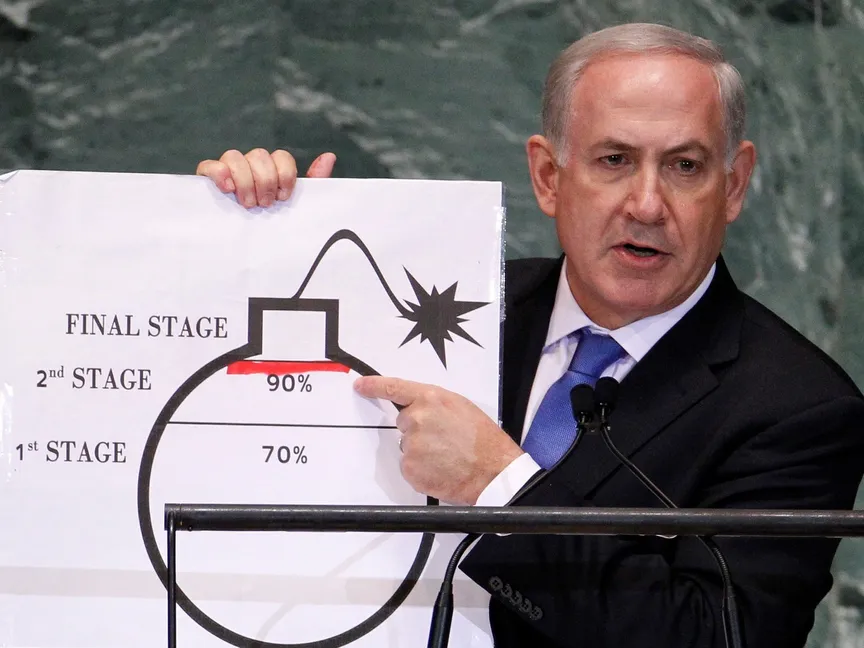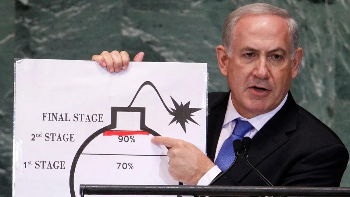 وفي 2012، قدَّم نتنياهو أمام الجمعية العامة للأمم المتحدة رسماً كاريكاتيرياً يُظهر ما وصفه بتقدم إيران نحو امتلاك القنبلة النووية، وهو مشهد أثار اهتماماً واسعاً.