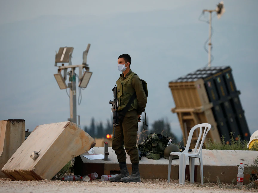 جندي إسرائيلي يقف بجوار إحدى بطاريات نظام القبة الحديدية لاعتراض الصواريخ بالقرب من الحدود اللبنانية- 27 يوليو 2020 - REUTERS