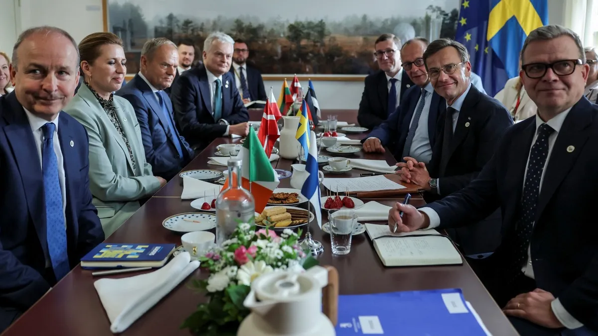 المستشار الألماني فريدريك ميرز ورئيس الوزراء البولندي دونالد توسك ورئيس الوزراء الفنلندي بيتيري أوربو ورئيسة وزراء الدنمارك ميت فريدريكسن والرئيس الليتواني جيتاناس ناوسيدا ورئيس الوزراء الأيرلندي ميشيل مارتن ورئيس الوزراء السويدي أولف كريسترسون ورئيسة وزراء إستونيا كريستين ميشال يجتمعون في بروكسل بقمة الاتحاد الأوروبي ببلجيكا. 26 يونيو 2025 - REUTERS