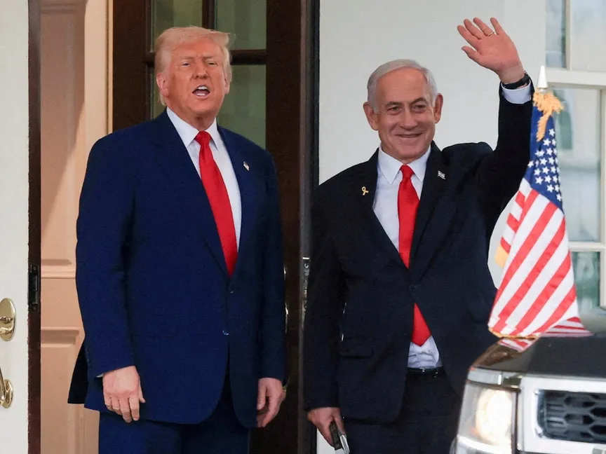 الرئيس الأمريكي دونالد ترمب يتحدث بينما يلوح رئيس الوزراء الإسرائيلي بنيامين نتنياهو بعد اجتماع في البيت الأبيض بواشنطن في الولايات المتحدة. 7 أبريل 2025 - REUTERS