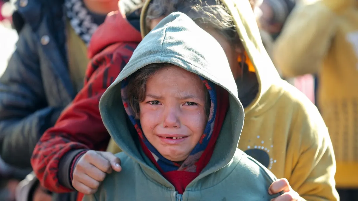 طفل فلسطيني يبكي خلال انتظاره في طابور لتلقي الطعام في خان يونس جنوبي قطاع غزة. 2 يناير 2025 - Reuters