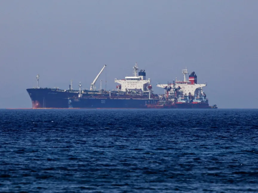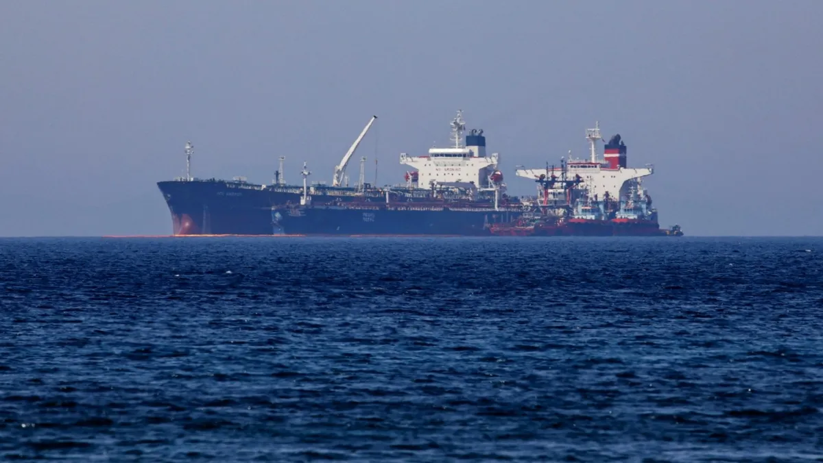 ناقلة نفط تحمل العلم الليبيري تنقل النفط الخام من ناقلة نفط إيرانية قبالة سواحل اليونان، 26 مايو 2022. - REUTERS