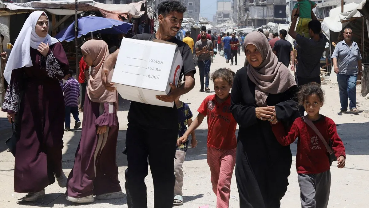 عائلة فلسطينية تحمل صندوقاً للمساعدات الإنسانية في بيت لاهيا بشمال قطاع غزة. 26 يونيو 2025 - REUTERS