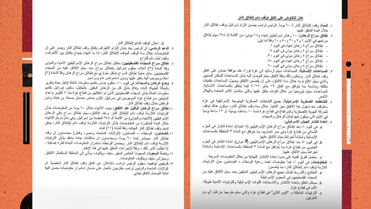 حصلت "المجلة" على النص الجديد لاتفاق وقف إطلاق النار بين إسرائيل و"حماس"، الذي يضغط الرئيس الأميركي دونالد ترمب لإنجازه قبل لقائه رئيس الوزراء الإسرائيلي بنيامين نتنياهو في واشنطن يوم الاثنين.