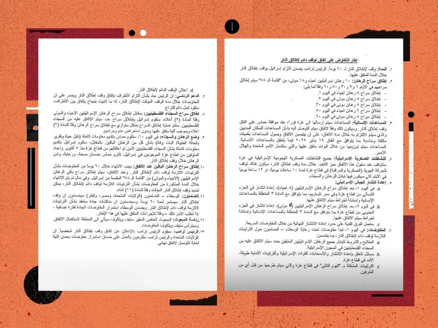 8-إطلاق سراح السجناء الفلسطينيين: بمقابل إطلاق سراح الرهائن الإسرائيليين الأحياء والموتى، ووفقا للمادة (2) أعلاه، ستقوم إسرائيل بإطلاق سراح عدد سيتم الاتفاق عليه من السجناء الفلسطينيين. وستتم عملية إطلاق السراح بشكل متوازٍ مع إطلاق سراح الرهائن وفقا للمادة (2) أعلاه وبموجب آلية متفق عليها ودون استعراض عام ومراسم.