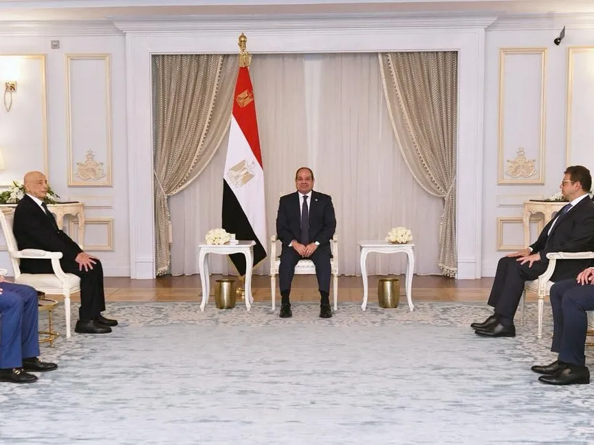 الرئيس المصري عبدالفتاح السيسي يستقبل رئيس مجلس النواب الليبي عقيلة صالح ومستشاره السياسي حميد الصافي في مصر. 5 يوليو 2025 - الرئاسة المصرية