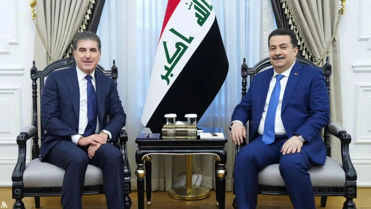 رئيس مجلس الوزراء، محمد شياع السوداني خلال استقباله رئيس إقليم كردستان نيجرفان بارزاني، 22 فبراير 2025 - "وكالة الأنباء العراقية واع"