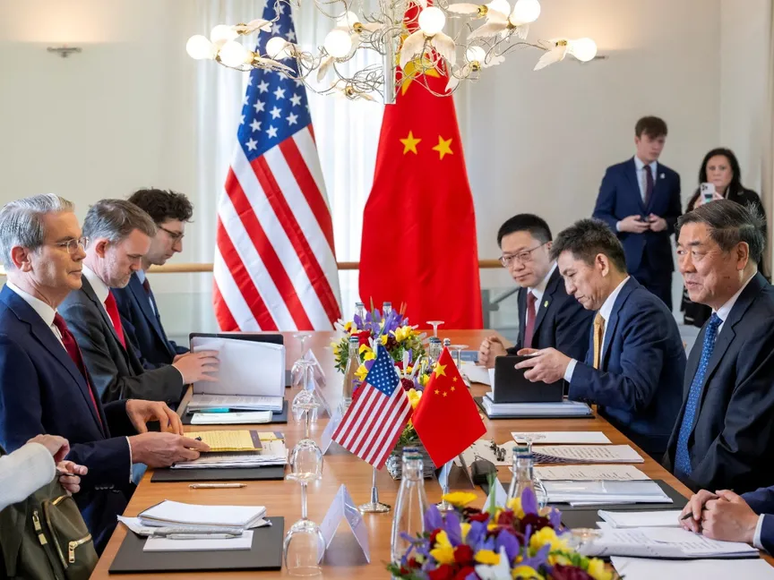 وزير الخزانة الأميركي سكوت بيسنت، والممثل التجاري الأميركي جيميسون جرير، والممثل التجاري الدولي للصين ونائب وزير التجارة لي تشنج جانج، ونائب رئيس مجلس الدولة الصيني هي ليفنج خلال مفاوضات في جنيف بسويسرا. 10 مايو 2025 - Reuters