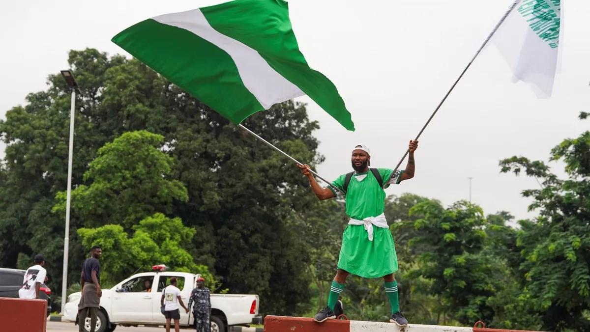متظاهر يحمل العلم النيجيري أثناء مشاركته في احتجاج مناهض للحكومة في أبوجا. 1 أغسطس 2024 - Reuters