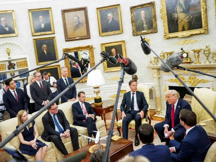 الرئيس الأميركي دونالد ترمب ونائبه جيه دي فانس ووزير الخارجية ماركو روبيو خلال لقاء مع الأمين العام لحلف شمال الأطلسي مارك روته في البيت الأبيض. 14 يوليو 2025 - Reuters