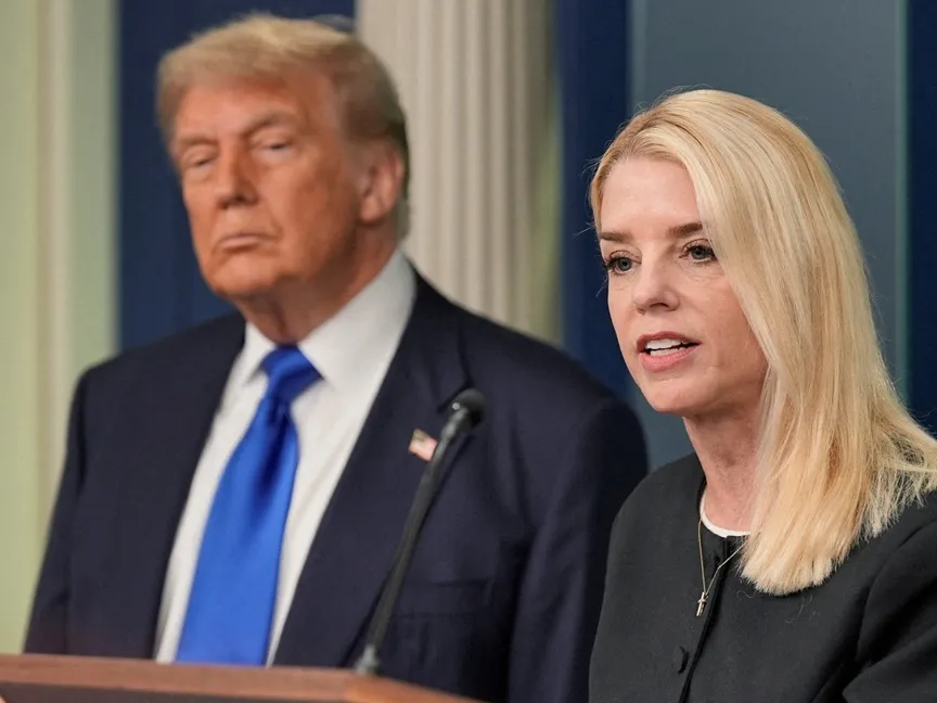 وزيرة العدل الأميركية بام بوندي تتحدث بجانب الرئيس دونالد ترمب إلى وسائل الإعلام في غرفة المؤتمرات الصحفية بالبيت الأبيض. 27 يونيو 2025 - REUTERS
