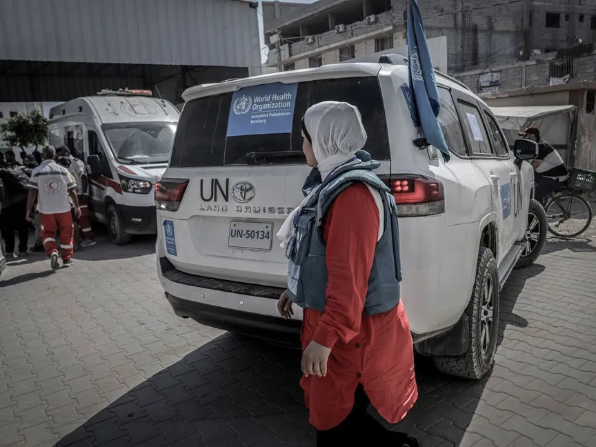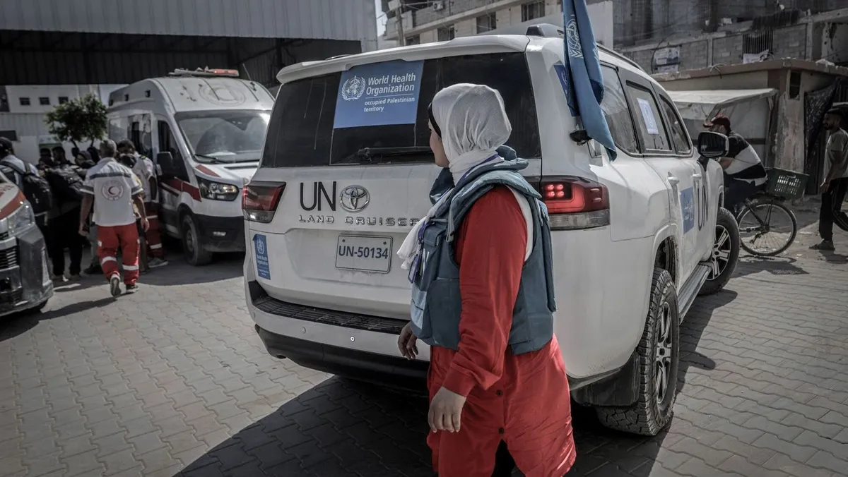 سيارات الأمم المتحدة داخل مستشفى الشفاء خلال إجلاء منظمة الصحة العالمية مصابين فلسطينيين لتلقّي العلاج في مدينة غزة، 15 يوليو 2025 - Bloomberg