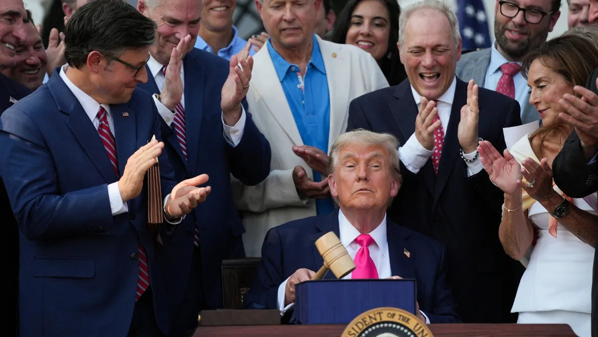 وفي لحظة مليئة بالدلالات السياسية، سلم رئيس مجلس النواب الأميركي مايك جونسون المطرقة التشريعية لترمب خلال مراسم توقيع مشروع القانون الجديد في البيت الأبيض يوم الرابع من يوليو الجاري، قائلاً: "سيدي الرئيس، هذه هي المطرقة التي استخدمت لإقرار مشروع القانون الكبير والجميل.. وأريدك أن تحتفظ بها".
