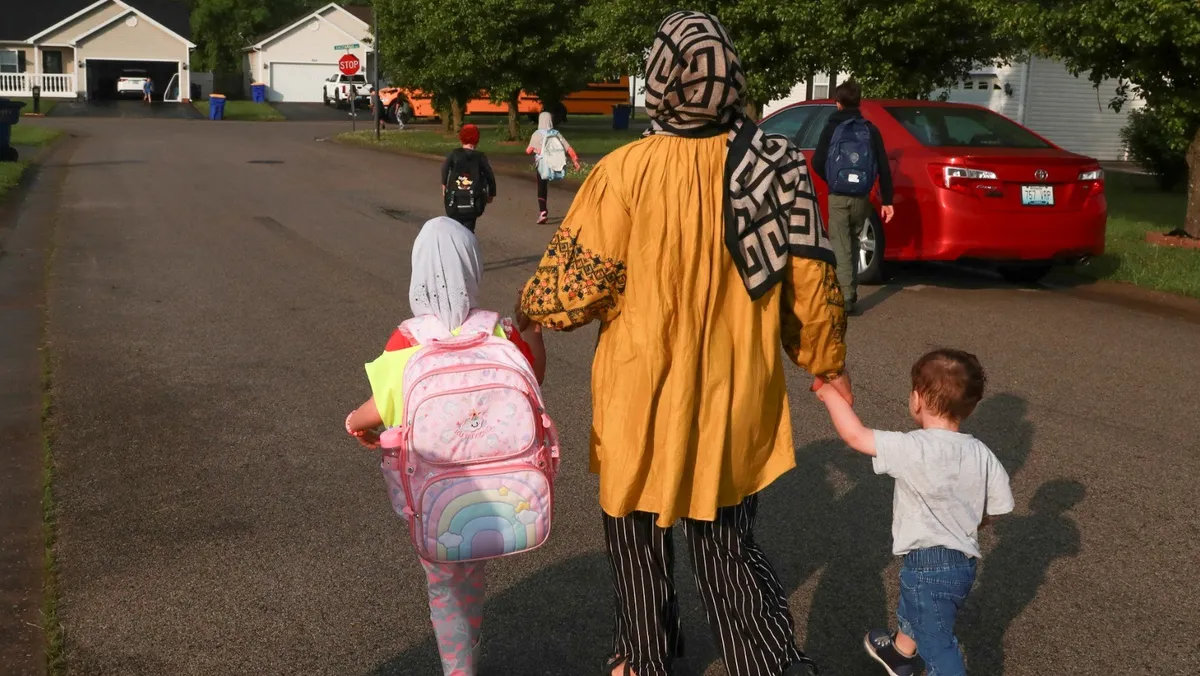 لاجئة أفغانية تمشي مع أطفالها نحو حافلة المدرسة في بولينج جرين بولاية كنتاكي الأميركية. 30 أبريل 2025. - REUTERS