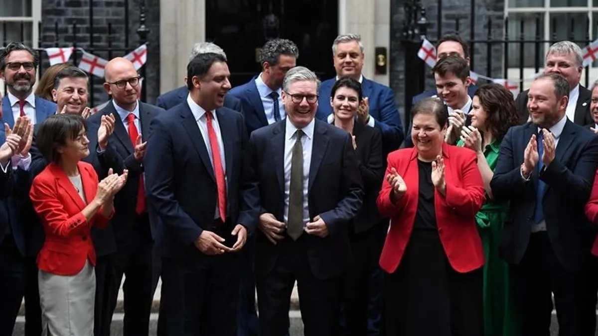 رئيس الوزراء البريطاني كير ستارمر يقف أمام مقر رئاسة الوزراء في 10 داونينغ ستريت برفقة نواب حزب العمال الاسكتلندي، في لندن، بريطانيا. 9 يوليو 2024. - Reuters