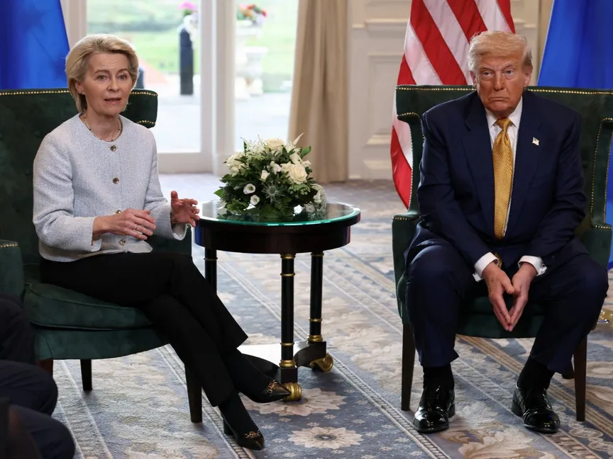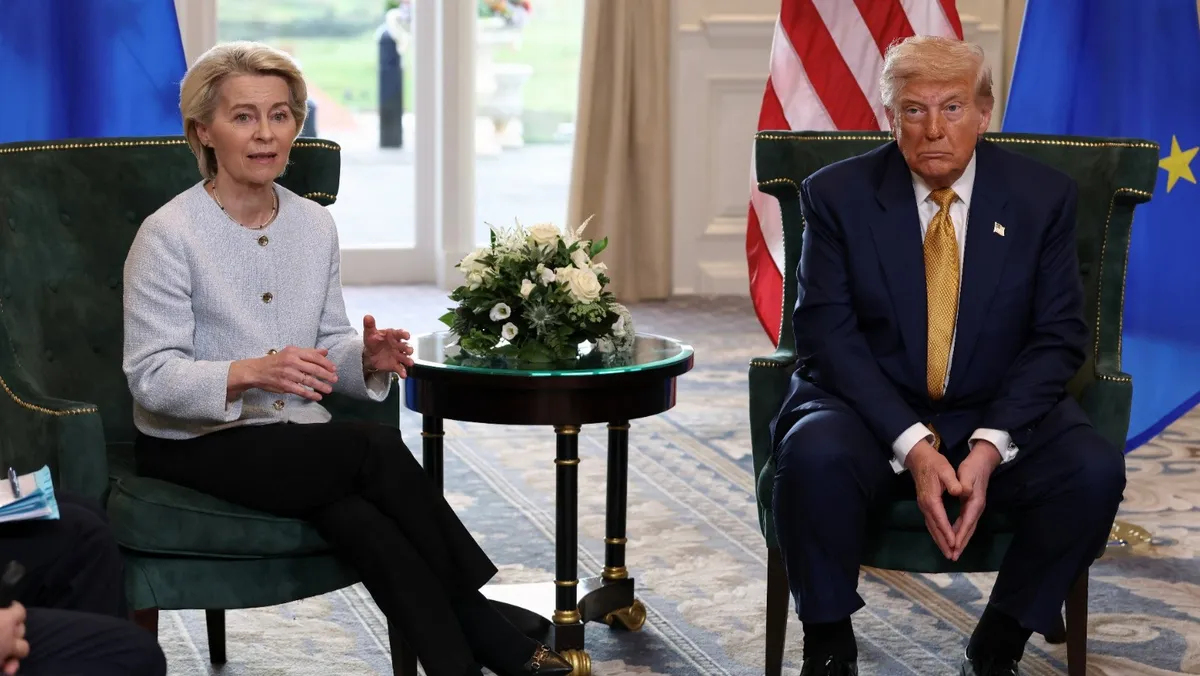 وتوصلت الولايات المتحدة والاتحاد الأوروبي إلى اتفاق تجاري ينصّ على فرض رسوم جمركية بنسبة 15% على الصادرات الأوروبية، في ختام لقاء جمع ترمب ورئيسة المفوضية الأوروبية أورسولا فون دير لاين في تيرنبيري، باسكتلندا.