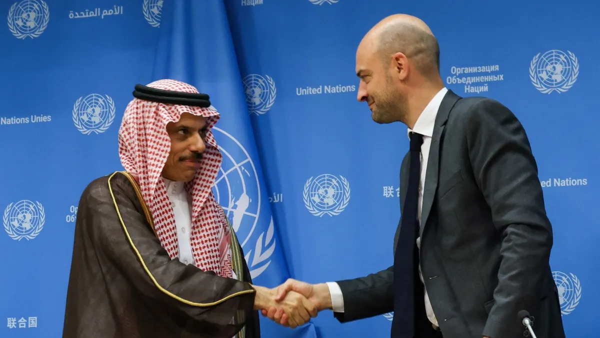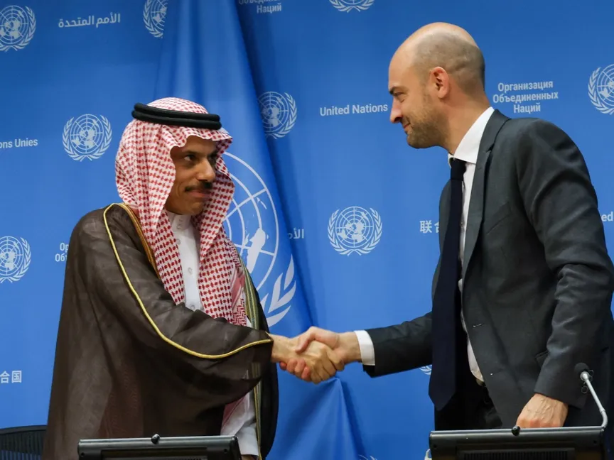 ورحب الأمير فيصل بن فرحان في مؤتمر صحافي مع نظيره الفرنسي جان نويل بارو، على هامش مؤتمر حل الدولتين الذي انطلق برئاسة سعودية فرنسية في نيويورك، بإعلان الرئيس الفرنسي إيمانويل ماكرون عزم بلاده الاعتراف بدولة فلسطين، ووصفها بـ"خطوة تاريخية تجسد دعم المجتمع الدولي للحقوق المشروعة للشعب الفلسطيني".