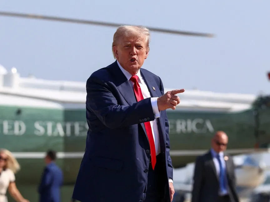 الرئيس الأمريكي دونالد ترمب يلوح بيده بعد نزوله من الطائرة أثناء توجهه إلى اسكتلندا، قاعدة أندروز المشتركة، ماريلاند، الولايات المتحدة. 25 يوليو 2025 - Reuters