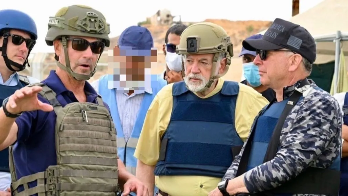 المبعوث الرئاسي الأميركي ستيف ويتكوف (بالقبعة السوداء إلى اليمين) إلى جوار السفير الأميركي لدى إسرائيل مايك هاكابي خلال زيارتهم مركز لتوزيع المساعدات في غزة. 1 أغسطس 2025 - X@SEPeaceMissions