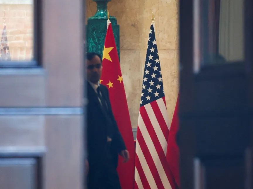 رجل يقف بجانب العلمين الأميركي والصيني خلال ثاني أيام محادثات تجارية بين الولايات المتحدة والصين في لندن. 10 يونيو 2025 - Reuters