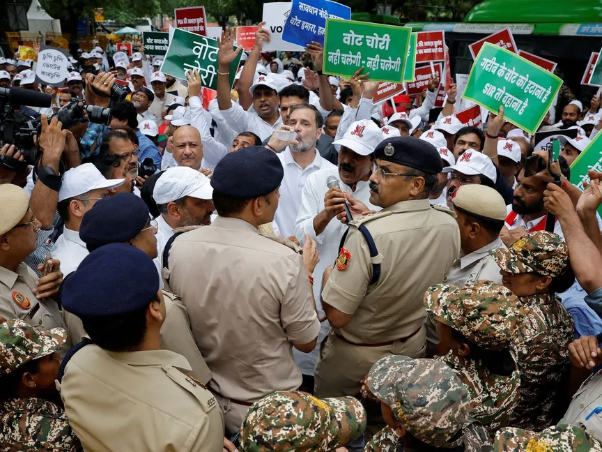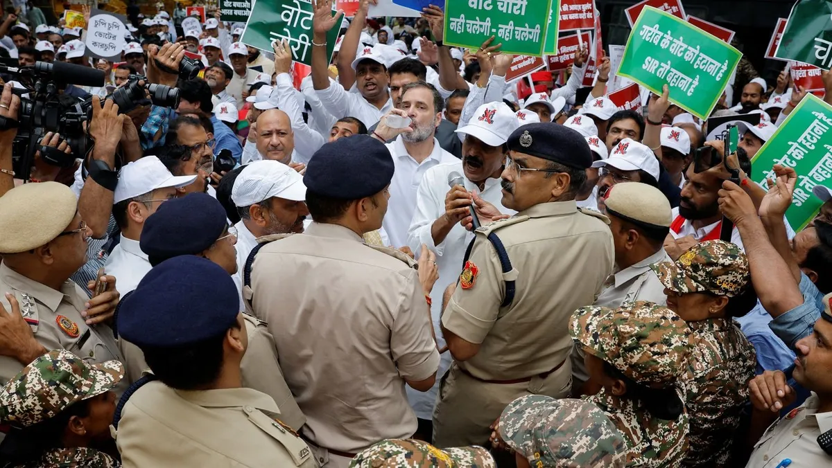 وشارك نحو 300 من قادة المعارضة، من بينهم راهول غاندي من حزب المؤتمر المعارض الرئيسي، في مسيرة من البرلمان إلى مقر لجنة الانتخابات المستقلة، لكن الشرطة أوقفتهم.