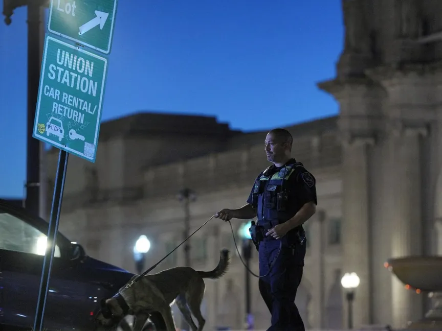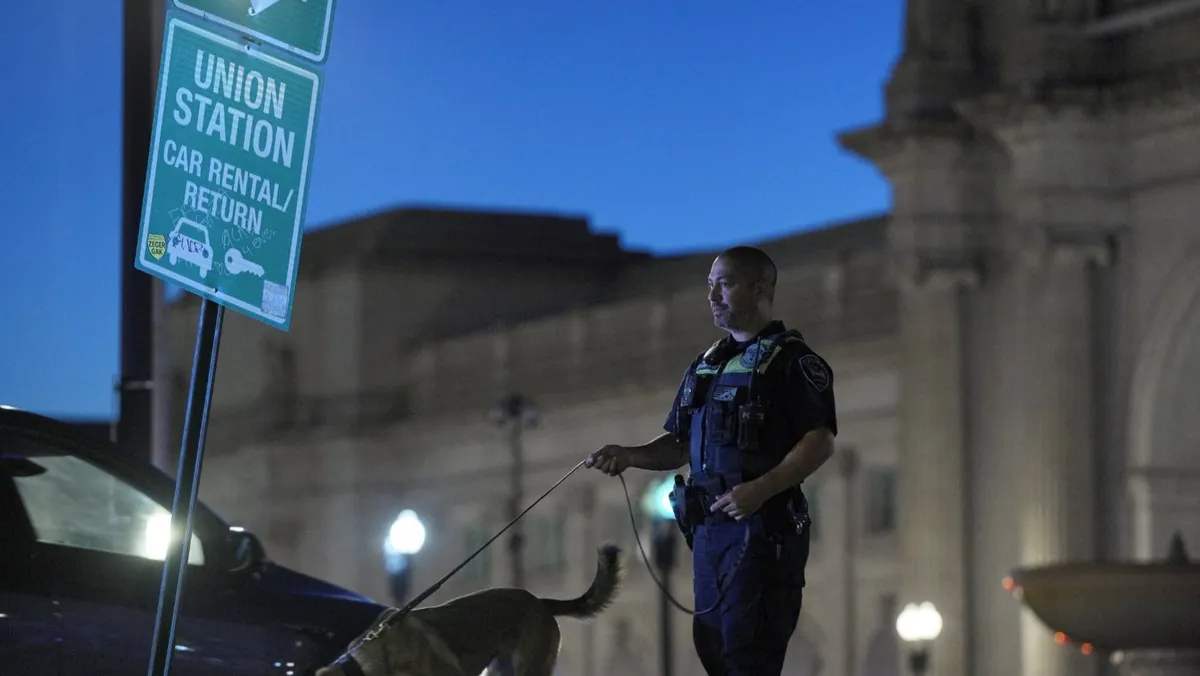 أحد عناصر الشرطة الأميركية بالقرب من محطة الاتحاد في واشنطن العاصمة. 11 أغسطس 2025 - reuters