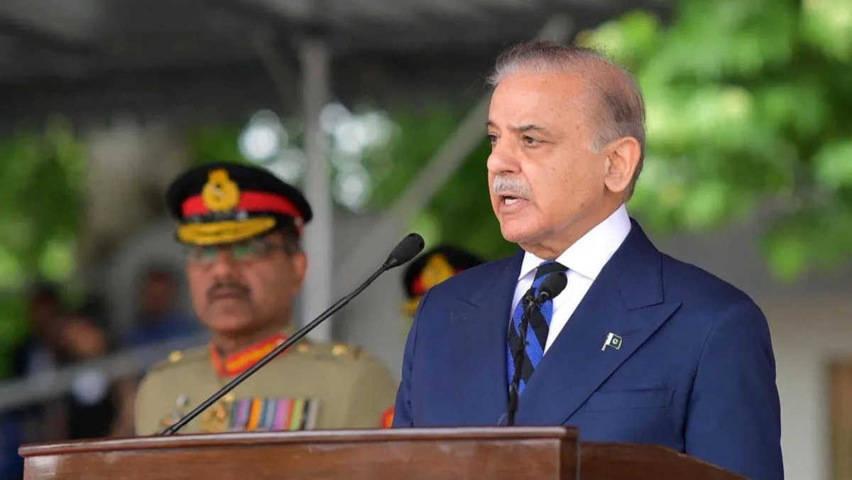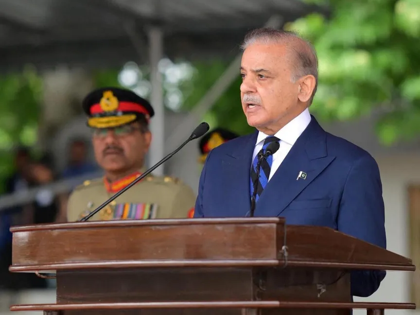 رئيس الوزراء الباكستاني شهباز شريف يتحدث خلال حفل تخريج الدورة الطويلة 151 في الأكاديمية العسكرية الباكستانية كاكول في أبوت آباد، باكستان. 26 أبريل 2025 - Reuters