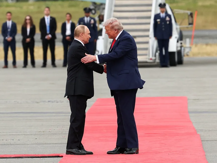 وقبل انعقاد القمة المرتقبة بين الزعيمين بشأن الحرب بين روسيا وأوكرانيا، استقبل ترمب الرئيس الروسي على سجادة حمراء بمدرج في قاعدة للقوات الجوية الأمريكية، وتصافح الرئيسان بحرارة ولمس كل منهما ذراع الآخر قبل أن يستقلا سيارة ترمب الليموزين إلى مكان عقد اللقاء.