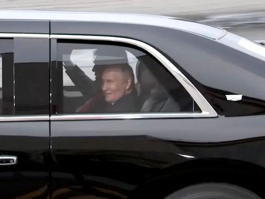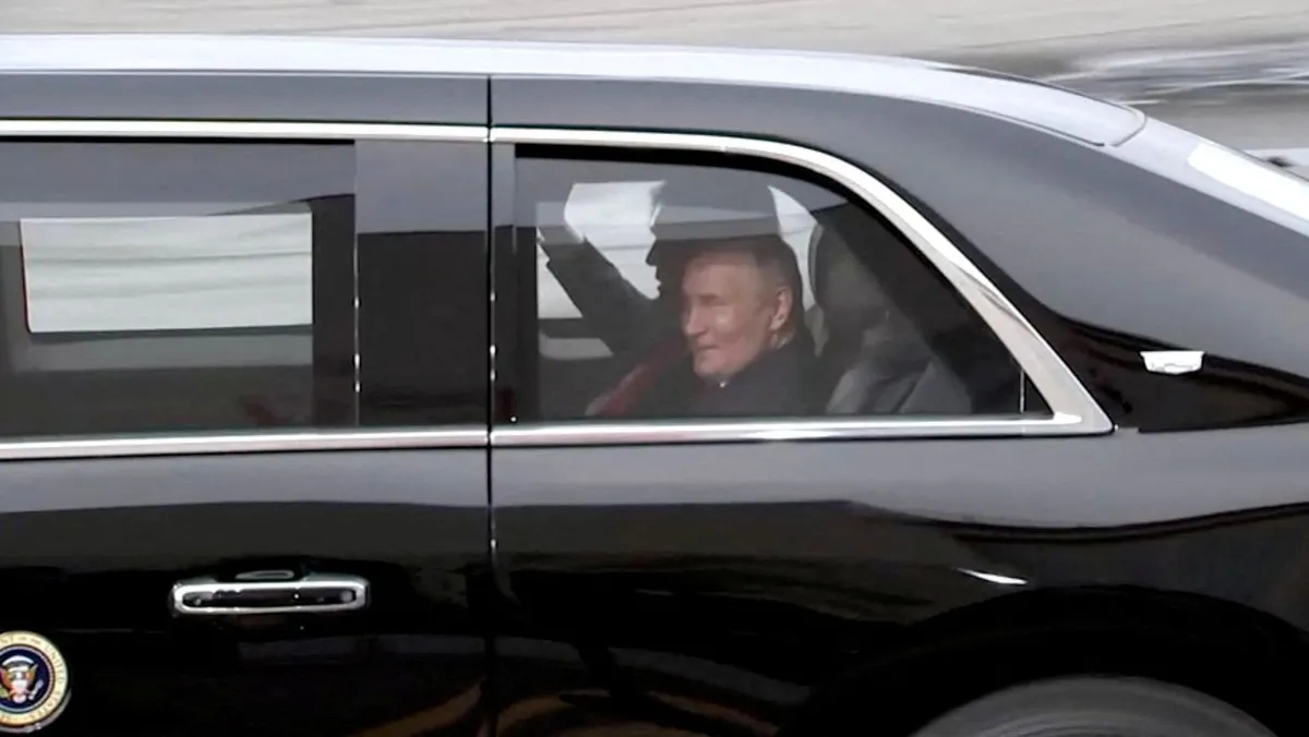 الرئيس الأميركي دونالد ترمب والرئيس الروسي فلاديمير بوتين يتبادلان الضحك في السيارة قبيل قمتهما في ألاسكا، في قاعدة إلمندورف-ريتشاردسون المشتركة، 15 أغسطس 2025. - via REUTERS