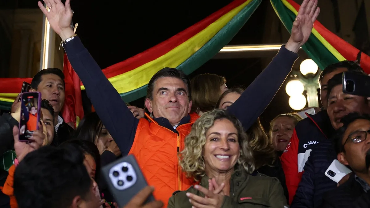 المرشح الرئاسي البوليفي الوسطي السيناتور رودريجو باز يحتفل بعد تقدمه بالانتخابات في لاباز ببوليفيا. 17 أغسطس 2025 - Reuters