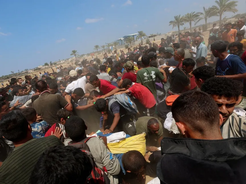 آلاف الفلسطينيين يحاولون الحصول على مساعدات إنسانية أسقطتها الطائرات الحربية على دير البلح في شمال قطاع غزة. 18 أغسطس 2025 - REUTERS