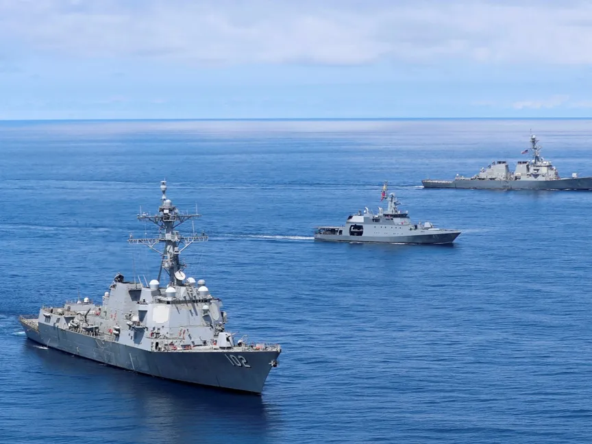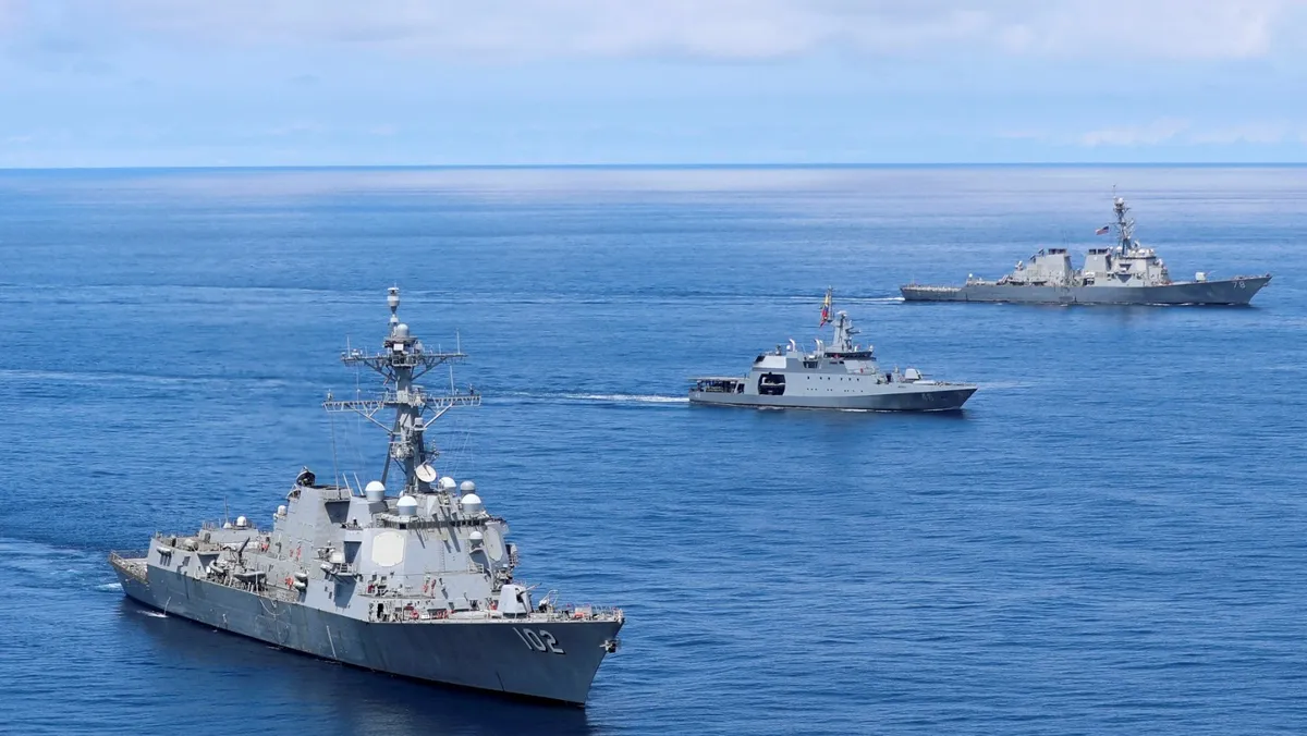 3 سفن حربية أميركية إحداها من طراز يو إس إس سامبسون تبحر في مياه المحيط الهادئ خلال مناورات بحرية للدعم التكتيكي والعملياتي في البحار الجنوبية. كولومبيا في 29 يونيو 2024 - reuters