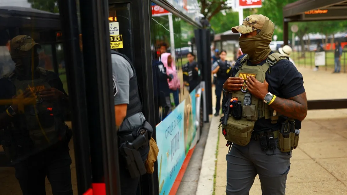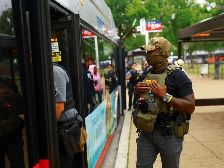 أحد عملاء مكتب التحقيقات في وزارة الأمن الداخلي خلال دورية مراقبة في محطة حافلات أنكوستيا بعد نشر الرئيس الأميركي دونالد ترمب قوات الحرس الوطني في واشنطن. 21 أغسطس 2025 - REUTERS