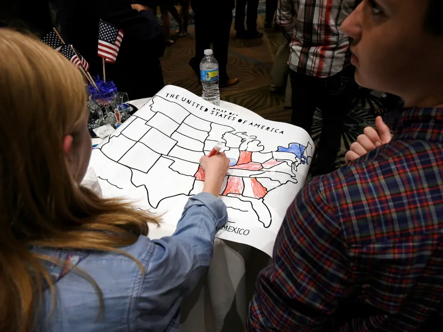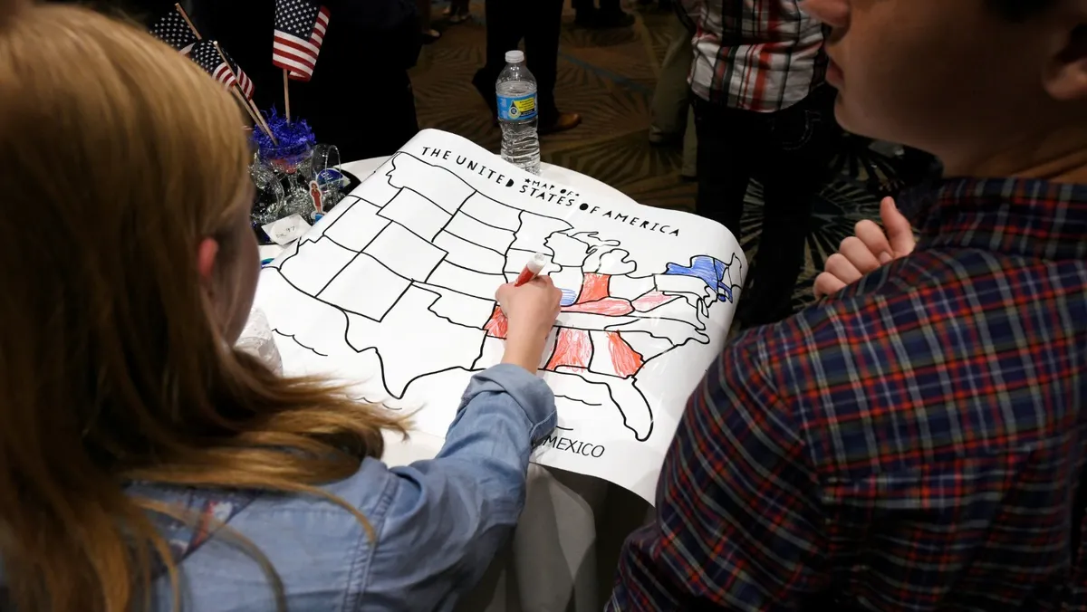 فتاة تلوّن خريطة انتخابية للولايات المتحدة باللون الأحمر أو الأزرق عند الإعلان عن نتائج الانتخابات العامة الأميركية. 8 نوفمبر 2016 - Reuters