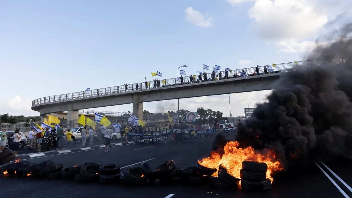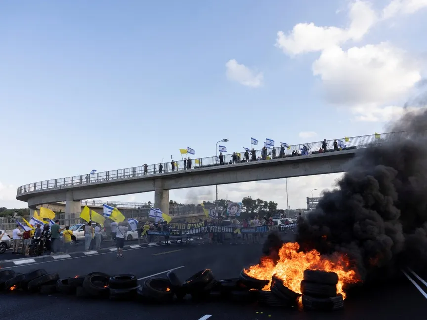 أغلق محتجون إسرائيليون يطالبون بالتوصل إلى صفقة لإطلاق سراح المحتجزين، وإنهاء الحرب على غزة، الثلاثاء، طرقاً رئيسية في تل أبيب، ومناطق أخرى بإسرائيل، فيما تجمع محتجون أمام السفارة الأميركية، حسبما ذكرت صحيفة "تايمز أوف إسرائيل".